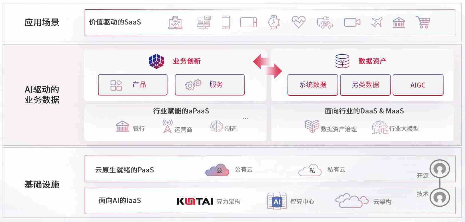 数字时代,,围绕企业数字化转型的关键要素,,,,亚洲必赢数码开创性的提出数云融合战略和技术体系框架,,,,着力在云原生、、数字原生、、、AI原生和信创产业上架构产品和服务能力,,为处在不同数字化转型阶段的快消零售、、、、汽车、、、、金融、、、医疗、、、、政企、、、教育、、、运营商等行业客户提供泛在的敏捷IT能力和融合的数据驱动能力,,,,构建跨界融合创新的数字业务场景和新业务模式,,,,助力企业级客户建立面向未来的核心能力和竞争优势,,,全面推动社会的数字化、、、、智能化转型升级。。。