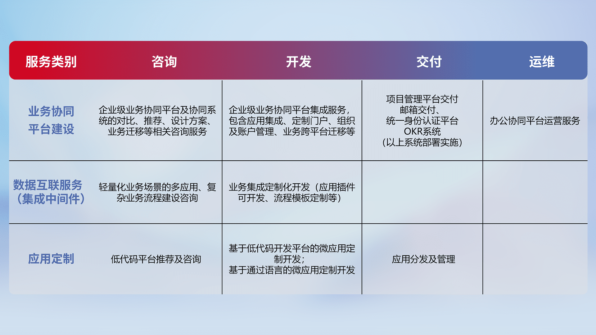 针对钉钉、、、、企微、、、IDaas等平台级产品提供产品的规划、、方案、、、交付、、定制化开发等服务,,,,实现如统一协同办公、、、智能客户服务、、、、混合会议管理、、智能数据查询、、等业务场景,,,实现数字化转型。。。