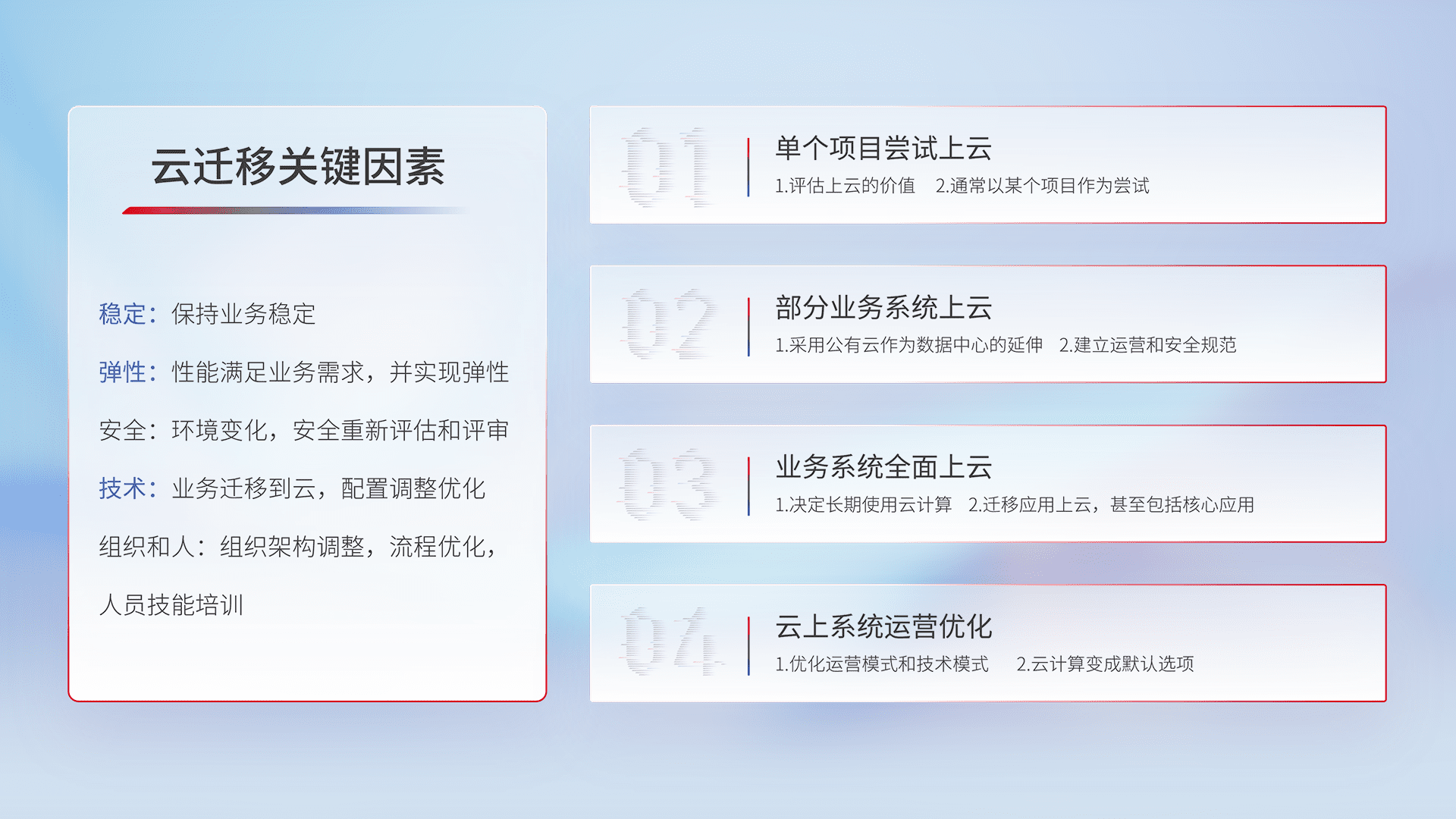 结合实际业务,,,从规划设计、、、云平台选型、、、云原生改造、、、、数据迁移、、、、集成交付,,,迁移全过程为客户识别最佳上云路径,,,做好风险识别管理,,,设计网络架构、、身份权限、、安全审计合规、、、、操作审计、、、、日志审计、、、、监控告警策略、、、多站点容灾设计等,,,对云上基础设施进行整体规划,,,,提升IT治理水平,,,以满足弹性、、、、高可用、、、、高性能的需求。。。