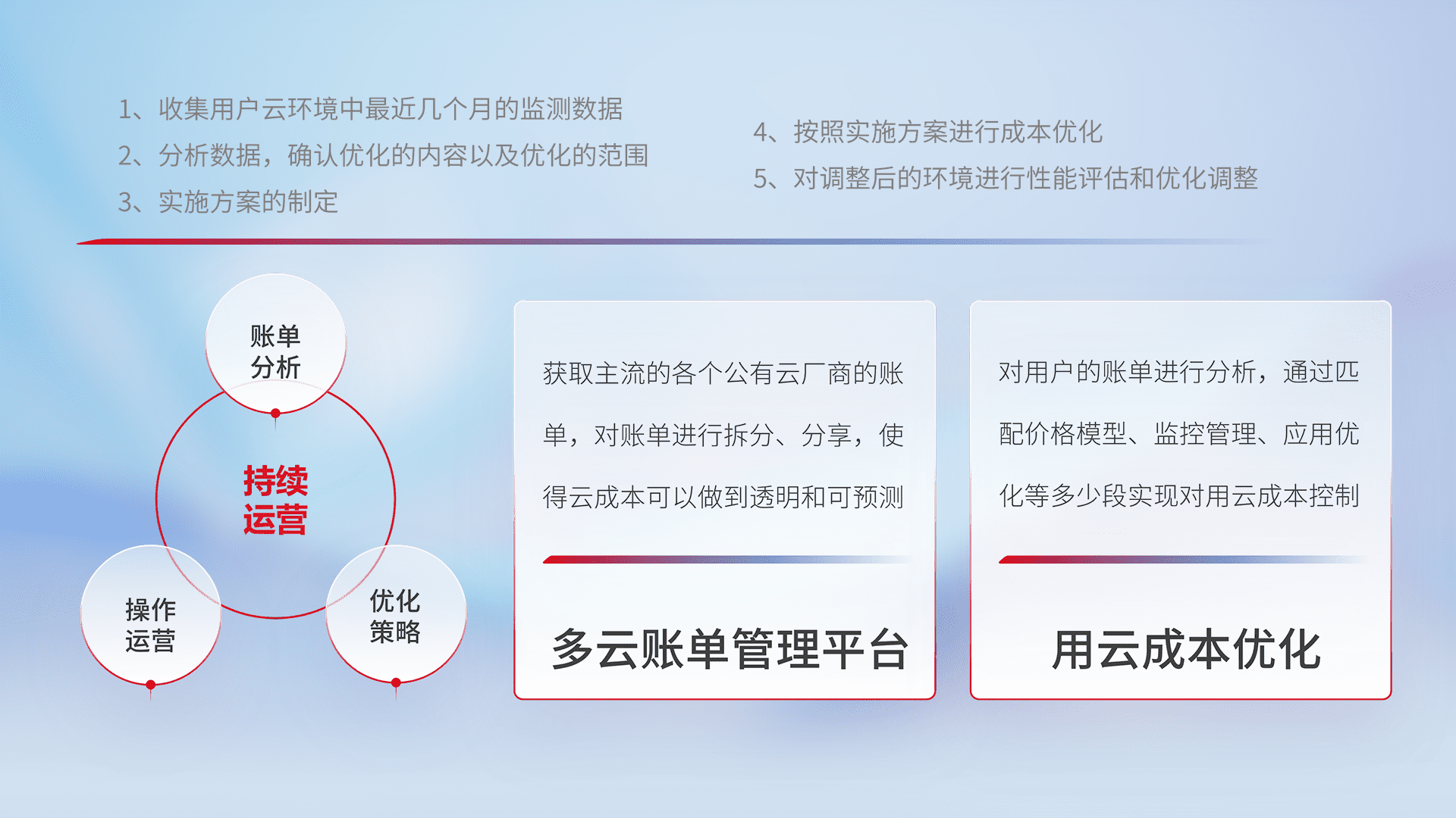 通过多云纳管,,,以统一的资源数据模型把客户的云资源进行抽象和封装,,,进而实现对多云资源的统一操作,,保障云资源管理的可靠性、、、稳定性与可用性。。量身定制化运维内容,,,,配置、、、开发运维、、、、补丁管理、、、备份、、、监控、、、、认证和访问管理、、审计和日常巡检等,,,保障在用云过程中的可靠度,,,稳定度以及高可用率。。。。
