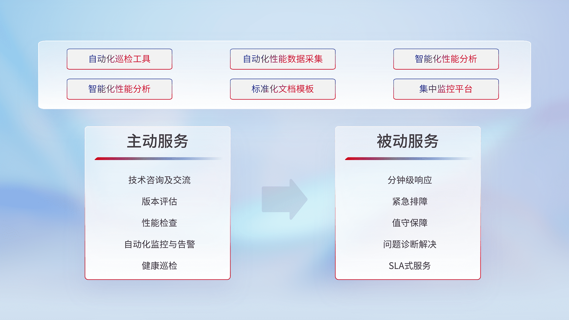 智能化工具和标准化文档,,,保障服务质量,,,提供主动服务(包含技术咨询、、、版本评估、、性能检查、、、、自动化监控与告警、、、健康巡检)和被动服务包含(分钟级响应、、、、紧急排障、、、、值守保障、、问题诊断解决、、、、SLA服务)。。
